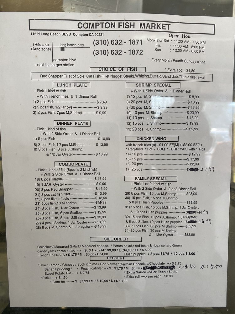 Compton Fish Market, located at 116 N Long Beach Blvd in Compton, CA, is a hidden gem for seafood enthusiasts. The menu boasts an impressive array of offerings, from 8 Pcs Fish and 15 Pcs Medium Shrimp family specials to a variety of fried fish and shrimp options, including the popular catfish and red snapper. Customers rave about the freshness and flavor of the dishes, often requesting their fish fried to perfection.